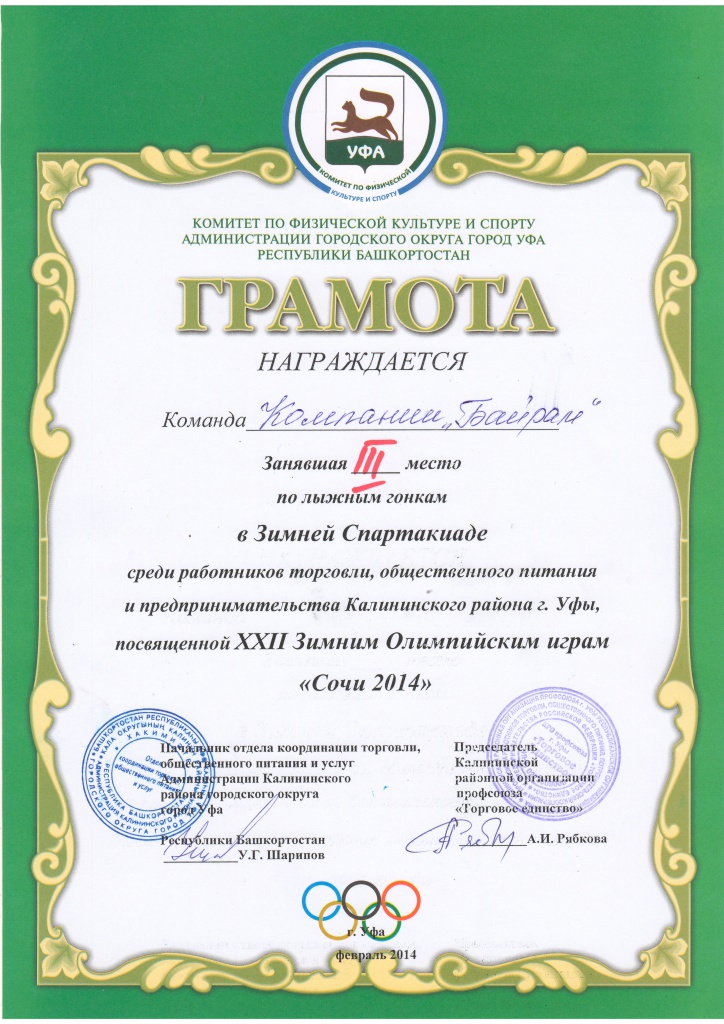 14 февраля на стадионе им. Гастелло прошла Зимняя спартакиада среди работников торговли, общественного питания и предпринимательства Калининского района, посвященная Зимним Олимпийским играм в Сочи-2014. Активное участие в олимпийской спартакиаде приняла команда торговой сети «Байрам», заняв почетное место в тройке сильнейших.