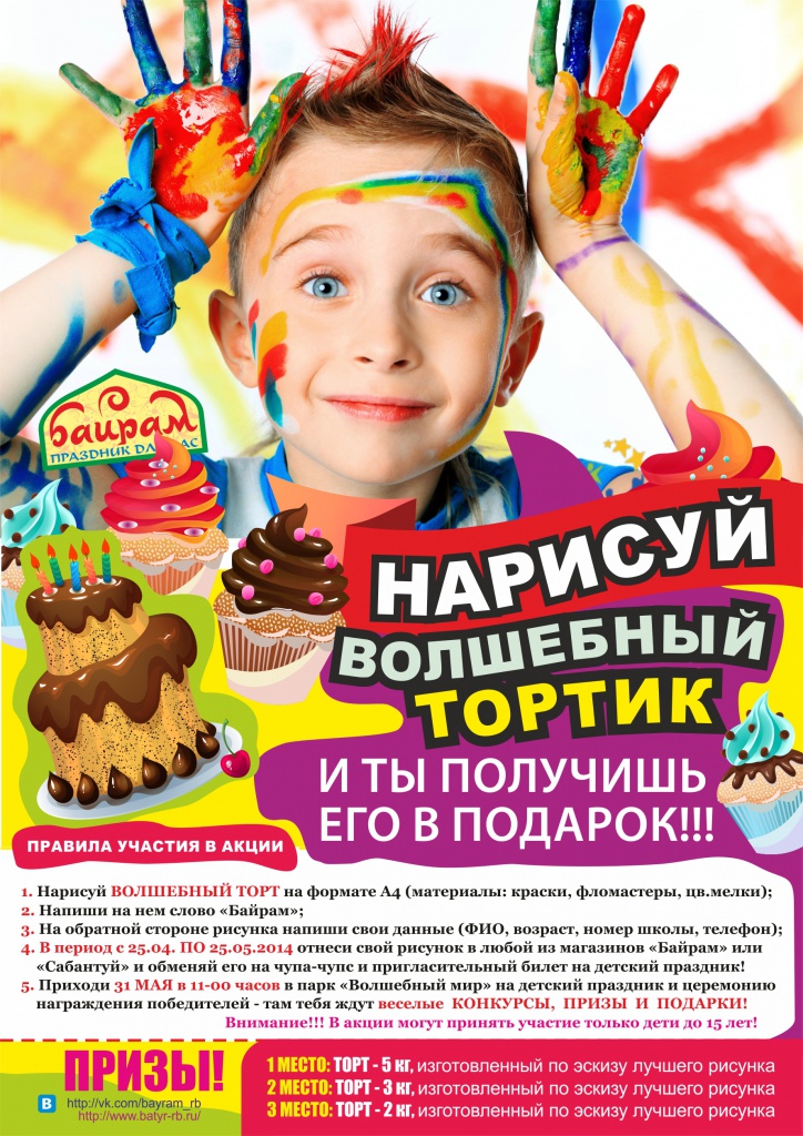 Примите участие в творческом конкурсе «Волшебный тортик»! Приносите до 25 мая детский рисунок торта со словом «Байрам» в любой магазин «Байрам», супермаркет «Сабантуй» или в Отдел рекламы и PR нашей Компании и получите гарантированный приз «чупа-чупс», а 31 мая приходите вместе с детьми на детский праздник в уфимский парк «Волшебный мир», где будут объявлены победители конкурса. В программе праздника игры, конкурсы, которые проводят аниматоры с призами и подарками.