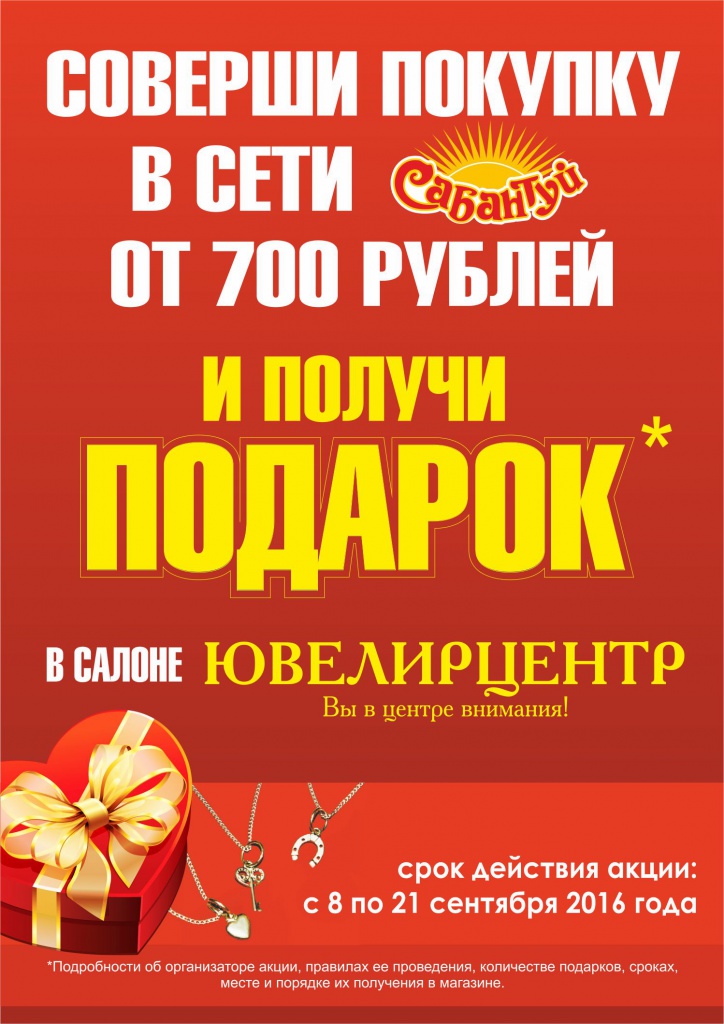 НАДПИСЬ: «Акция «Ювелирцентр», «Русское золото», «Аквамарин, Александрит». Попроси на кассе купон и получи украшение в ювелирном салоне. Адрес салона указан на выданном купоне».